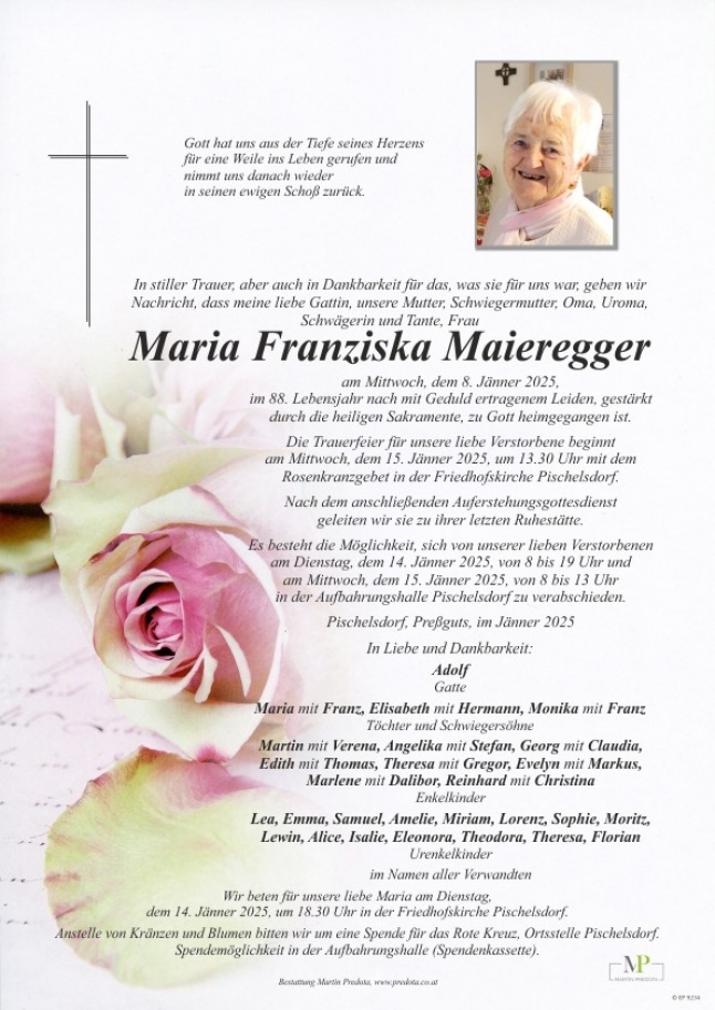 Danke für die netten Worte und vielen Gebete, unser aufrichtiges Beileid Franz, Rosi und Roland Mauerhofer