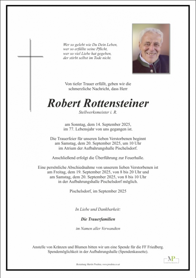 Lieber Robert! Wir werden Dich stets in Erinnerung und gutem Angedenken behalten. Ruhe in Frieden! Fam.Hollaus!