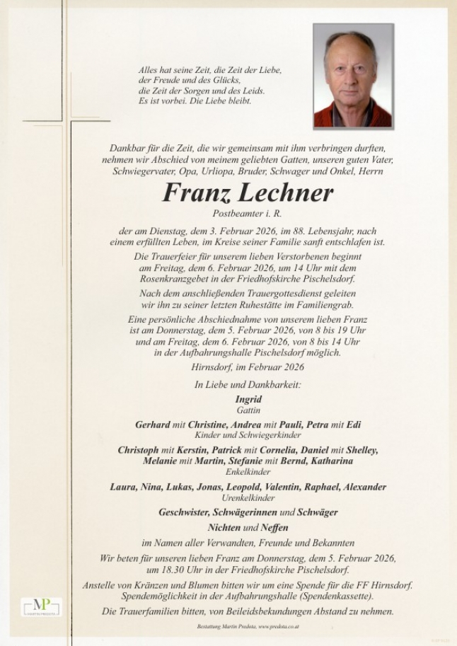 Lieber Franz,gerne denke ich an unsere gemeinsame Zeit im Postamt Hirnsdorf zurück.Ruhe in Frieden. Viel Kraft deiner Familie. Conny und Heinz H&
