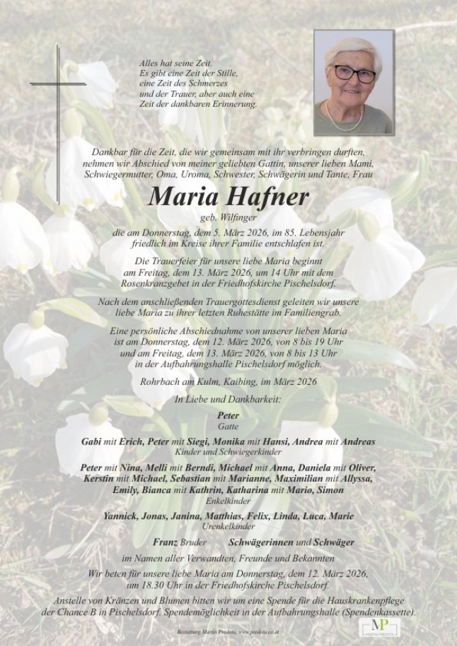 Liebe Maria ,du hast den Lebensgarten verlassen ,doch deine Blumen blühen weiter.Unser Aufrichtiges Beileid der Familie .Franz Hilde u.Oma Strebl