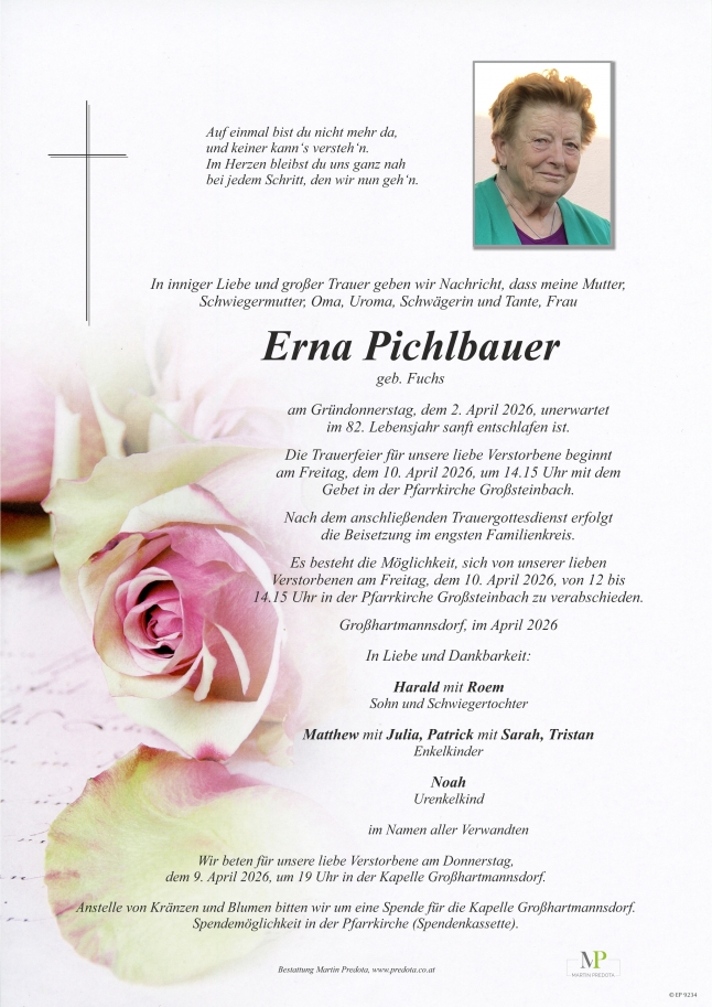 In lieber Erinnerung, Tante Erna, Ruhe in Frieden. ARMIN , BETTINA , KLARA UND RAPHAEL..